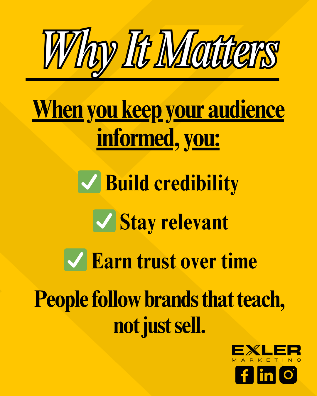 If you’re looking for more practical tips to help your business build trust and grow smarter, stick with us here on #TheGroundFloor. We’re going to continue sharing insights that help you level up your digital presence one step at a time. On Exler Marketing’s social media pages, we’re constantly sharing quick, practical marketing tips, including the one featured here! Check it out on our Instagram here.
