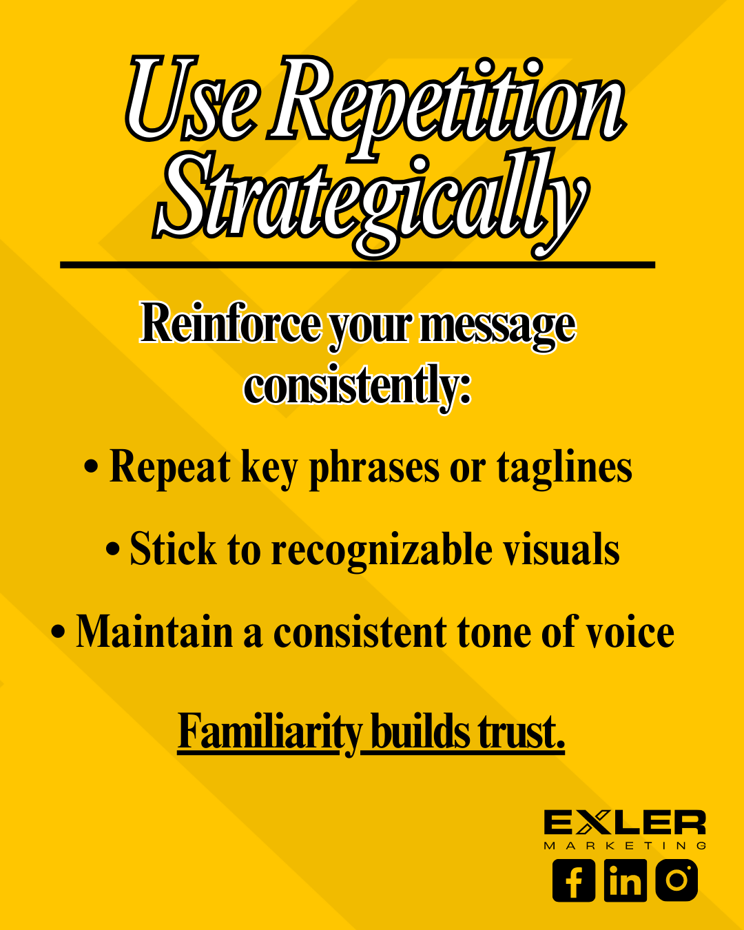One of the most overlooked tools in marketing is repetition. Many brands fear “sounding repetitive,” so they constantly reinvent their messaging. The result? Confusion. Consistency builds familiarity. Familiarity builds trust.